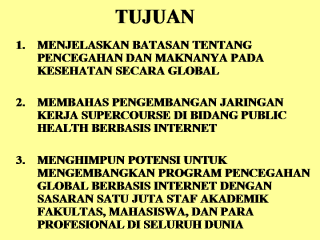Semua akhli kesehatan masyarakat dan dosen FK jaringan supercourse bisa menggunakan slide ini untuk melengkapi kuliah tentang pencegahan global dan maknanya bagi masyarakat di lingkungannya masing-masing.