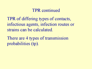 p00: tp from unvaccinated infective to unvaccinated susceptible p01: tp from vaccinated infective to unvaccinated susceptible p10: tp from unvaccinated infective to vaccinated susceptible p11: tp from vaccinated infective to vaccinated susceptible To estimate the effect of a vaccine in reducing susceptibility, compare the ratio of p10 to p00. To estimate the effect of a vaccine in reducing infectiousness, compare the ratio of p01 to p00. To estimate the combined effect of a vaccine, compare the ratio of p11 to p00. |