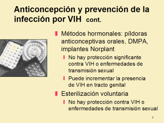 | Métodos anticonceptivos hormonales no ofrecen significativa protección contra ETS. Hay algunos datos, no conluyentes, que esos métodos pueden incrementar la diseminación del VIH en genitales, así como un incremento en la susceptibilidad al VIH en las mujeres no infectadas. Esterilización voluntaria, aunque reduce el riesgo de infecciones tubarias adquiridas o salpingitis, no ofrecen protección contra ETS y VIH. |