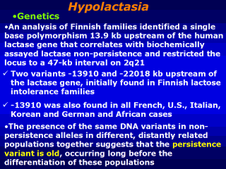 Schematic representation of the region between the two highlighted genetic markers that is associated with adult-type hypolactasia (Enattah and colleagues). Vertical bars within the MCM6 gene represent the exons, the widths indicating relative size. The two associated single base polymorphisms (SNPs) lie within the indicated introns of the MCM6 gene which is located 5’ to the LCT (lactase-phlorizin hydrolase) gene on human chromosome 2. The arrows indicate the direction of gene transcription (the centromeric region of the chromosome is located to the left). The scale bar at the bottom of the figure indicates the size of the DNA region occupied by the MCM6 gene. The numbers at introns 13 and 9 indicate the positions of the SNPs relative to the transcriptional start site of lactase (redrawn from Enattah and colleagues20). |