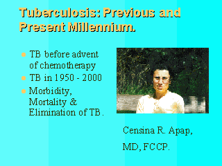 | This lecture is intended to give an overview of TB (Tuberculosis) before (1850 1950) and after (1950 - onwards) the advent of anti-tuberculosis drugs. Definitions used in Public Health Reports / Surveys will be given. The factors contributing to infection, progression of disease, morbidity and mortality of the population, and the possibility to eliminate the disease are reviewed. |