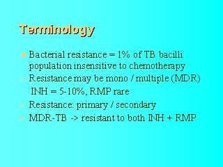 drugs. MDR-TB defines TB resistant to both INH and RMP. Bacterial resistance may be primary or secondary. Primary resistance occurs when patients not previously treated with anti-TB drugs, become infected from a patient with resistant TB. Secondary resistance occurs when anti-tuberculosis chemotherapy is used improperly: mono-therapy, insufficient dosage of time of R/ and poor compliance. Drug resistance leads to R/ failures and disease recurrence. DOT (Directly Observed Treatment) is called for, when poor compliance is suspected. |