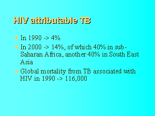 of TB in sub-Saharan Africa is rapidly increasing due to the HIV epidemic. It is estimated that 4% of the 7,5 M (million) new TB cases worldwide was attributable to HIV in 1990, and that in 2000, 14% of the 10,2 M new cases will be attributable to HIV. For the period 1990-1999, the WHO (World Health Organization) estimated 30 M deaths from TB: 2,9 M (9,7%) due to TB in association with HIV. The majority of these deaths expected in sub-Saharan Africa and South East Asia. In Western Europe and industrialized countries a similar problem may arise if: a. Contact tracing and surveillance of high risk groups are relaxed, b. AIDS epidemic in allochtones and natives expands further, c. immigrants with high endemic TB prevalence escape radiological check-up and follow-up. |