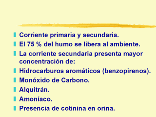 La eliminacion urinaria de cotinina en no fumadores expuestos a fumadores en el hogar y la de los expuestos en sitios de trabajo son equivalentes. La exposicion en ambos lugares provoca la aparicion de cotinina en la orina, estimando que los no fumadores expuestos a humo de tabaco ambiental absorben una dosis de nicotina equivalente a un sexto a un tercio de un cigarrillo, sin embargo, con exposiciones intensas, la cantidad de nicotina puede ser equivalente a 1 a 2 cigarrillos por dia. En nuestro pais, el 68,2 % de los niņos y adolescentes son fumadores pasivos en sus casas. |