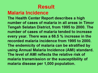 the endemicity of malaria is determined by the AMI as: a. AMI = 50 : Low b. AMI 51 – 150 : Moderate c. AMI 150 – 250 : High Over 250 : Very High. The number of villages which have a high Annual Malaria Incidence has tended to increase every year. In 1995 five percent of villages had more than 250 cases per 1,000 population. The percentage of villages with more than 250 cases per 1,000 rose to 13.5 percent in 2000. |