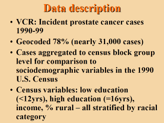 lat/long; block group ~ 1,200, tract ~ 4,000 Data entered into a geographic information system. We calculated average annual incidence rates for prostate cancer for African-Americans and whites at the block group level, and then we mapped these incidence rates. |