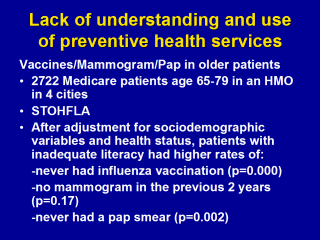 | Scott TL, Gazmararian JA, Williams MV, Baker DW. Health literacy and preventive health care use among medicare enrollees in a managed care organization. Med Care 2002;40:395-404. |