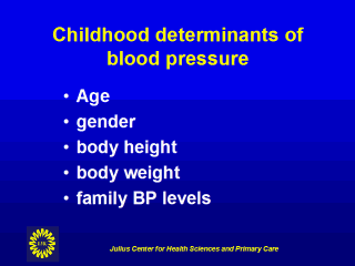 | We kennen een aantal belangrijke determinanten van de bloeddruk op de kinderleeftijd. Dit zijn als belangrijkste de leeftijd, het geslacht, lengte en gewicht en typische bloeddruk in families. |