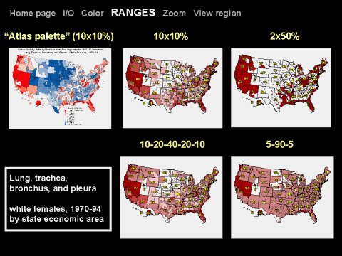 The left map in the first row uses the two-color, 10-decile atlas convention. The remaining 4 maps display the same data using a monochrome color scheme with a variety of range choices. |