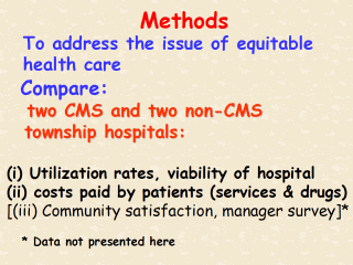 Data collected from: (a) Monthly hospital tabulations of outpatient and inpatient costs for services during 2001 and 2002, and hospital incomes from RCMS (b) Our cross-sectional patient survey Aug 2001 in the 4 township (former commune) hospitals |