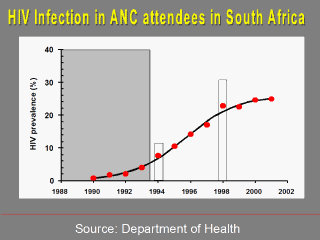 Generalised epidemic begins 1988-1993 The major epidemic as a result of heterosexual spread of HIV is associated with a concomitant epidemic in infants born to HIV infected mothers. The period 1988-1993 marks the beginning of the generalised or "major" epidemic of Clade C HIV infection in South Africa. This exponential increase in HIV infection had a doubling time of approximately 15.1 months. |