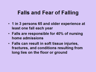 among seniors. Falls are a major health problem among seniors. It is not surprising that seniors are fearful of falling because falls are a threat to individual function and independence.