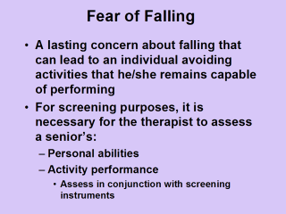 much information. Recall the definition presented earlier: Fear of falling is a lasting concern about falling that can lead to an individual avoiding activities that he/she remains capable of performing. To determine if the individual is at risk for avoiding activities that he/she is capable of performing, it is necessary to assess further and then make a clinical judgment. - There is a formal or informal assessment of the senior’s personal abilities. (abilities such as strength and balance, cognitive abilities, safety awareness) - Also there is an assessment of the senior’s activity performance. |