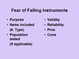 several factors. First we値l consider the purpose of the instrument--why the instrument was created. We値l look at the number of items included and the type of items. A greater number of items could either be useful in providing more information or may be a burden on the client. The type of items are also important to consider. Some activities are more hazardous to perform than others. Depending on the functional level of the client, clinicians may want to choose instruments geared towards lower functioning or higher functioning seniors. The population that the instrument was tested on will also be helpful in determining the appropriateness of the tool for a particular client. If no validity and reliability testing was done, there will be no population mentioned. We値l mention whether validity and/or reliability tests have been conducted. I値l define a few terms in the next overhead to describe how this was done to ease interpretation of the table. However, we will not dwell on the psychometric properties of the instruments. Finally, we値l look at the pros and cons of each instrument. |