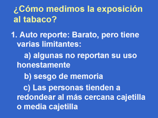 | Estudiando los efectos del tabaquismo y la reducción del mismo sobre el resultado del nacimiento, ha sido difícil debido a la ausencia de herramientas necesarias para medir seguramente la exposición al tabaco. Autoreporte es usado frecuentemente, pero las mujeres pueden reportarlo en forma errónea por múltiples razones. Además, la exposición puede ser afectada por la marca de cigarrillos consumidos, el porcentaje de cigarrillos actualemnete fumados y la profundidad de la inhalación. |