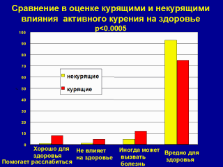 | Мы нашли существенные различия в прогнозах состояния своего здоровья курящих и некурящих, в их оценке вреда как активного, так и пассивного курения. Некурящие более склонны считать курение вредным для здоровья. |