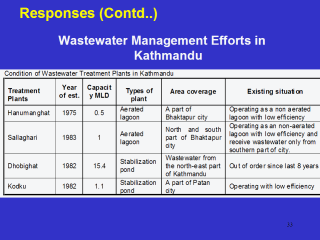 | Only 15% households in the Kathmandu valley have access to treatment system but they are not in working condition. |