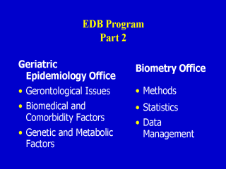 The Geriatric Epidemiology Office integrates molecular and genetic epidemiology and interdisciplinary studies of functional outcomes, disease endpoints and mortality in older persons. This includes identification of novel risk factors and design of studies involving biomarkers, selected polymorphisms and exploration of gene-environment interactions. Studies in the Geriatric Epidemiology Office have involved particularly metabolism and nutritional risk factors, chronic inflammation, and comorbid risk factors and diseases. Biometry