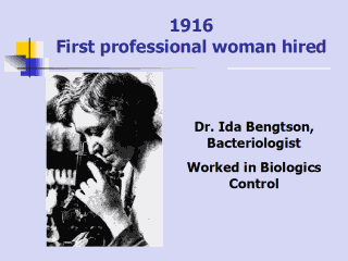 | In 1916, director George McCoy hired the first female Ph.D. bacteriologist in the Hygienic Laboratory. Dr. Ida Bengtson worked in Biologics Control work and collaborated on research in infectious diseases. |