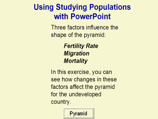 For example, you might like to demonstrate how the three factors which influence population structure affect a population pyramid. Your slide contains important text on the left and a button to call the exercise. You program the button to make the exercise appear. Details on how to do this is provided with the instruction that come with SP. |