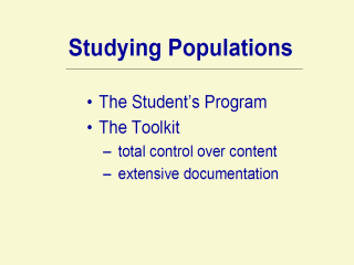 Many of the examples come from UK data sets. However, with the Toolkit, it is possible for you to change almost all the text, data and graphics, to suit local teaching needs. You can also seamlessly add totally new material to the package. Full instructions are given for doing this. |