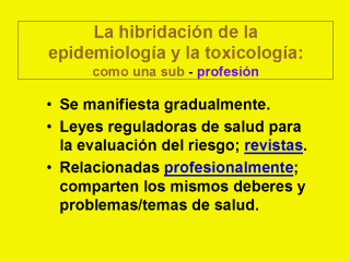 De manera diferente, la hibridación de la epidemiología y la toxicología como una sub profesión u ocupación especializada, ha sido mas exitosa y gradualmente en maduración. Por ejemplo, aquellos toxicólogos certificados con un Diplomado del American Borrad of Toxicology (DABT) deben aprobar un examen en epidemiología. Talleres recientes (WHO, 1995; NIH, 1999) que llaman a la integración de la valoración de la exposición con la epidemiología y la toxicología, también reflejan la tendencia a la hibridación. En los Estados Unidos, el Departamento de Salud de Texas y de Ohio tienen una división llamado Epidemiología y Toxicología (Ambiental) con una misión bien definida. Existe también una publicación internacional con un titulo similar: Epidemiología y Toxicología Ambiental. Como se dijera previamente, la concordancia con las leyes de salud frecuentemente requiere la realización de valoración del riesgo, el cual típicamente no puede realizarse con estudios epidemiológicos o toxicológicos por separado. Es también importante resaltar que aquellos temas de salud que requieren la mayor atención pública no son puramente académicos, médicos o clínicos en naturaleza sino ambientales. Para decirlo de otra manera, la hibridación de la epidemiología y la toxicología esta gradualmente alcanzando la superficie, simplemente porque existe una necesidad de que los epidemiólogos y los toxicólogos trabajen en sintonía uno con el otro para responder efectiva y eficientemente las demandas que provienen de todos los sectores de la población.