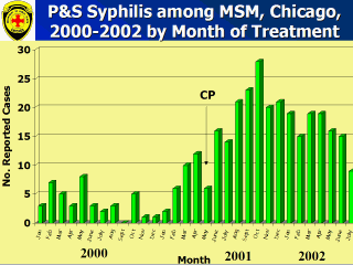 Chicago’s recent syphilis outbreak has been primarily in the MSM population. While P&S syphilis cases among MSM had occurred at a constant rate in the late 1990s, the numbers increased after May 2000. This was temporally coincident with a large MSM circuit party (a social gathering for thousands of men). One possibility is that increased numbers of anonymous partners during this event may have served as a trigger for the outbreak.