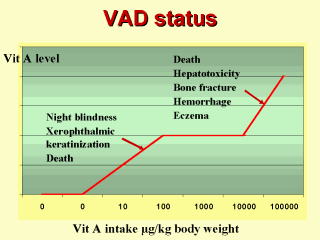 Vitamin A requirement is ~100-1000 µg/kg body weight/day Greatest need is during rapid growth VAD starts at 4 to 6 M of age Deficiency due to inadequate nutritional intake, frequent disease, malabsorption, diarrhea and febrile infections. |