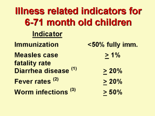 are: - Less than half the infants are fully immunized. - Measles case fatality rate is 1% or more - 2 week point prevalence rate of diarrhea diseases of 20% or higher (1) - 2 week point prevalence rate of fever of 20% or higher (2) - Worms infections rates especially ascaris in 50% or more of the population (3) |