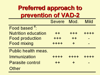 Other public health approaches: Other Severe Mod. Mild HW/S * - + - DD/AR I * * +++ + - Hygiene ++++ ++++ ++++ * provision of healthy water and sewage systems * * control of diarrhea and respiratory diseases Hygiene - improving personal hygiene In populations with severe public health problems supplementation in target groups and general populations are required. Target foods should be fortified, and food based approaches as well as public health measures should be instituted. # Vitamin A based food production, mixing vitamin A rich foods with other foods |
