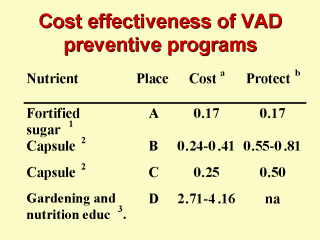 Cost a Estimated cost in $US/person in 1994$ Protect b Estimated cost per person year of protection (1994$) LOCATIONS: A - Guatemala 1976 - 1food fortification B - Haiti 1978 - 2supplementation C - Indonesia, Philippines 1975 - 2supplementation D - Guatemala 1994 (high risk persons)- 3dietary modification Reading: World Bank. Development in practice: Enriching lives: overcoming vitamin and mineral malnutrition in developing countries. 1994. Washington D.C., The World Bank.