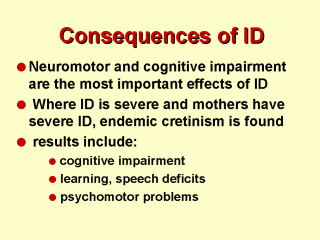 not be corrected. In less than severe ID, neurological effects range from detectable neurological changes to impaired learning capacity and performance in school, or reduced ability to handle formal tests of psychomotor functions. Readings: Stanbury ed., The damaged Brain of iodine deficiency. 1994, NY, Cognizant communications Meta-analysis of 18 studies covering 2214 persons suggests that ID persons have a mean IQ score 13.5 points lower than iodine sufficient persons. |