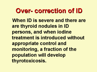 actions for micronutrient deficiencies. For iodine deficiency, toxicity of thyroid function can be induced when correction of ID is not carefully monitored. The potential harms and benefits will differ in each location and population and therefore have to be evaluated each time an intervention program is planned or performed. A balance between harm and benefit has to be achieved. |