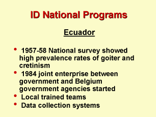 Salt iodization implemented through cooperation of salt industry General education in local languages School programs, radio programs, slide shows, lectures, press releases Results: Once a country with very high rates of ID Ecuador has now virtually eliminated the disorder Recent survey of ultrasonography in previousely severly affects areas, show absence of goiter. Successful results due to persistence and cooperation between industry, government, health community and mass media.