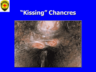 | This picture shows a "kissing" lesion, where apposition of an uninfected area leads to autoinoculation of treponemes from a primary chancre, producing a mirroring lesion. This is common in females and in perianal lesions. |