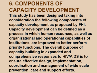 development comprises some or all of the following six components: 1) Human capacity: This involves the development of human skills capacity, and the effective use of managerial, professional and technical staff, and volunteers. It includes identifying the right people to be trained; developing and delivering training strategies that are responsive to the needs of the target audience; providing an appropriate learning environment for training and education; ensuring in-service/field supervision for continued skills transfer; and, especially in the case of HIV/AIDS, longer term mentoring for directional, emotional and moral support in FBOS. 2) Organizations and their management: This addresses how FBOs, their culture and management styles influence the use, efficiency and retention of skilled human resources for HIV/AIDS care, mitigation and prevention. 3) FBO institutional context: It includes the roles and responsibilities of different sectors of FBOs in the context of decentralization. 4) Networks and linkages: This includes multi-sectorial alliances and networks of different faith-based organizations to optimize resources and broaden the coverage of actions. 5) Social capital and community participation: Social capital refers to the processes between FBO leaders that establish networks, norms and social trust, and facilitate coordination and cooperation for mutual benefit. Community organization and participation concern complementarily of action, and strengthening social accountability and advocacy systems. 6) Contextual environment: This refers to the socioeconomic, cultural and political settings in FBOs that facilitate or constrain the functional capacity of individuals and organizations. One example is the degree of political acknowledgment and support for HIV/AIDS activities in FBOs. |