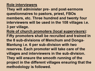 church animators: In order to assure community participation for the continuity of activities after this project has come to an end, each FBO will identify dedicated members who reside permanently in the village and are recognized leaders in the FBO who can read and write. These 324 people, that is, 130 in Menchum and 194 in Donga-Mantung will be trained to assist the pastors in sermons and ensure that all FBO members are interviewed during the pre- and post-tests. They shall also display cards and present interludes on HIV/AIDS prevention. Role of local health staff: They will advise FBOs on HIV/AIDS prevention, care and mitigation. Role of local NGOs The local NGOs will assist in the training of interviewers, promoters, animators, etc. Their workers understand the local dialects very well and will assist in community mobilization, social marketing and communication problems. Role of FBO groups - Mobilize and sensitize different FBO branches and members in the sub-divisions and divisions. Role of FBOs leaders - will be trained to give sermons with information on HIV/AIDS prevention, care and mitigation and other STIs. - Supervise FBO associations such as AIDS clubs, etc. under their care. Role of supervisors - Two supervisors (one for each division) will supervise the work by moving from village-to- village in FBOs to ensure that every body is doing his job well and that the methods outlined are followed. He will do all the follow-up and evaluate the work. |