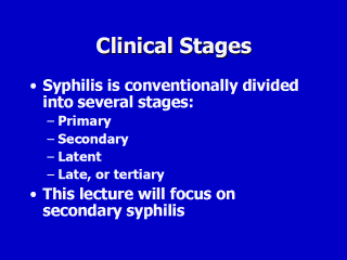 primary and secondary syphilis are well recognized. Staging is a clinical