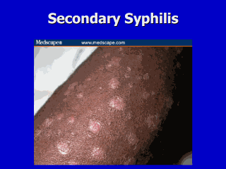 | Click on the picture for a link to a nice case presentation of secondary syphilis on the Medscape web site. This is a typical papulosquamous eruption of secondary syphilis in a dark-skinned individual. The case history is also illustrative in that the patient denied having contact with STDs, but had a spontaneously healing "spider bite" on the penis some weeks before. |