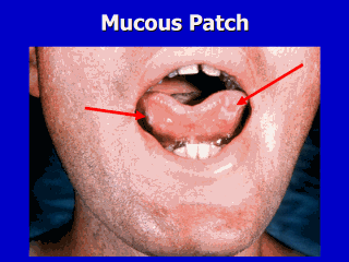 The arrows show a common oral finding in secondary syphilis – mucous patches. These are usually painless and are teeming with treponemes.