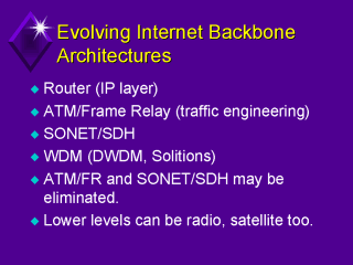 Design of the Internet backbone - Router : TCP/IP 2nd layer related, switching device (ATM, Frame Relay), traffic engineering, the products are most expensive - SONET/SDH: very high speed fiber optic network technology (more information) - WDM/DWDM: advanced optical network technology. Dense wavelength division multiplexing (DWDM) technology to offer a comprehensive, flexible, and scalable transport solution that reduces network costs (more information) |