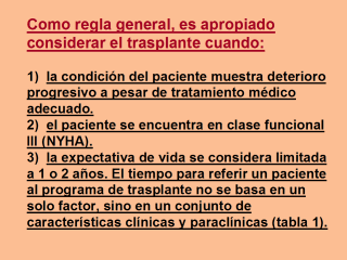 Tabla 1. TRASPLANTE PULMONAR: CRITERIOS DE SELECCIÓNENFERMEDAD VASCULAR - Clase funcional III (NYHA) PULMONAR - Presión media de la arteria Hipertensión Pulmonar Primaria pulmonar ≥ 55 mmHg - Presión media de la aurícula derecha ≥ 10 mmHg - Indice cardiaco < 4 L/min/m2 - Sin respuesta a vasodilatadores ENFERMEDAD RESTRICTIVA - Clase funcional III (NYHA) Fibrosis Pulmonar Idiopática - Capacidad Pulmonar Total ≤ 60% del valor predicho - Hipoxemia inducida por ejercicio - DLCO (Capacidad de difusión de monóxido de carbono) ≤ 30% ENFERMEDAD OBSTRUCTIVA - Clase funcional III (NYHA) EPOC - FEV1 ≤ 500 mL (≤ 20%) - Declinación rápida del FEV1 - Hipoxemia en reposo, hipercapnia - Pérdida de peso ENFERMEDAD SUPURATIVA - Clase funcional III (NYHA) Fibrosis Quística - FEV1 < 30% - Declinación rápida del FEV1 - Pérdida de peso - Hipoxemia en reposo, hipercapnia - Infecciones de repetición - Hemoptisis, Neumotora |