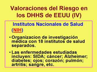 contribuyen a las actividades de Valoración del Riesgo. El Instituto Nacional del Cáncer y el Instituto Nacional de Ciencias de la Salud Ambiental continúan siendo los mas destacados en estudios cuantitativos relevantes para la VR. Los otros institutos de los NIH tienen su actividad enfocada sobre la identificación y caracterización de las causas de la enfermedad y la discapacidad. Juntos, sus actividades de investigación van desde investigaciones bioquímicas básicas realizadas in vitro y ADN recombinate hasta estudios epidemiológicos y ensayos clínicos en humanos. Algunos de los casos de estudio de los NIH que están relacionados con la VR incluyen: lípidos y cáncer; lípidos y enfermedades del corazón; mamografía; enfermedad renal por analgésicos; y clonación de shiga (DHHS EEUU, 1986). |