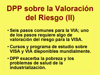 Para el tercer paso mencionado, se requiere alguna forma de VR para completar una VISA / VIA para cualquier proyecto de desarrollo. Hoy, los procesos de VISA y VIA están mas formalizados y reconocidos, como se evidencia por los numerosos cursos de salud ambiental y programas de estudio anunciados por Internet. Estos cursos y programas de estudio están disponibles en diferentes partes del mundo incluyendo Australia (Universidad de Griffith); Tailandia (Universidad del Príncipe de Songkla); Alemania (Universidad de Bielefeld); Brasil (Sociedad Brasilera para el Ambiente); y otros. A pesar de que el desarrollo de políticas y proyectos (DPP) está diseñado para mejorar las condiciones económicas y estándares de vida públicos, frecuentemente tienen efectos no buscados sobre la salud humana. Las DPP pueden causar o agravar la pobreza y los problemas de salud de la industrialización. |