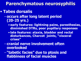 | These are the typical findings in tabes dorsalis. The ataxic, wide-based gait leads to foot-slapping. Trophic degenerative changes (Charcot joints) were commonly seen in the preantibiotic era but are rare now. Visceral crises included abdominal pain mimicing a surgical crisis. The Romberg sign (inability to stand with feet together and eyes closed without toppling over) isclassically present in patients with tabes dorsalis. |