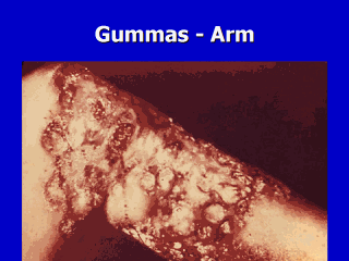 | Gummas may be quite extensive and coalescent. If not recognized and treated properly, they may cause significant tissue damage. They are easily confused with other diseases, e.g. cancer. |