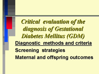 Gestational diabetes mellitus (GDM) is defined as any degree of glucose intolerance with onset or first recognition during pregnancy (Metzger BE, Coustan DR Diabetes Care 21 Suppl.2, B1-B167, 1998) . It is generally accepted that the diagnosis of gestational diabetes should be based on blood glucose testing. Two different approaches may be selected for diagnosis: The one-step approach: Consisting on the performance of an oral glucose tolerance test (OGTT) without previous blood glucose testing. This approach is recommended in high risk populations. The two step approach: A first step measuring plasma or serum glucose 1 hour after a 50-gr. oral glucose load (glucose challenge test or GCT), and on those women with values exceeding the diagnostic threshold, a second step performing an oral glucose tolerance test (OGTT). Regardless of the approach used, the diagnosis of GDM is based on the results of the oral glucose tolerance test. |