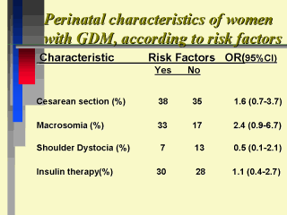 In a study by Weeks et al (1994), no differences were found in perinatal characteristics between GDM women with and without additional risk factors, except for an increased trend of macrosomia among newborn of mothers with risk factors. |