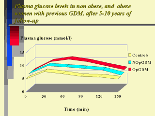 In a study by Damm et al (1995), women after a GDM pregnancy were followed for at least 5 years and re-examined to assess their plasma glucose responses after a glucose load. Plasma glucose levels were higher in obese women with previous GDM (Op GDM), than in non-obese women with previous GDM (NOp GDM). Control women had the lowest plasma glucose levels throughout the test. |