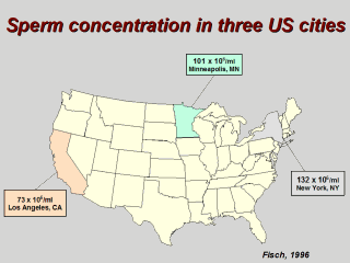 For example, in 1996 Fisch and colleagues reported that sperm concentration in Los Angeles, California was only 57% of that in New York City. Differences in study methods and populations in these uncontrolled comparisons made these geographic differences difficult to interpret. |
